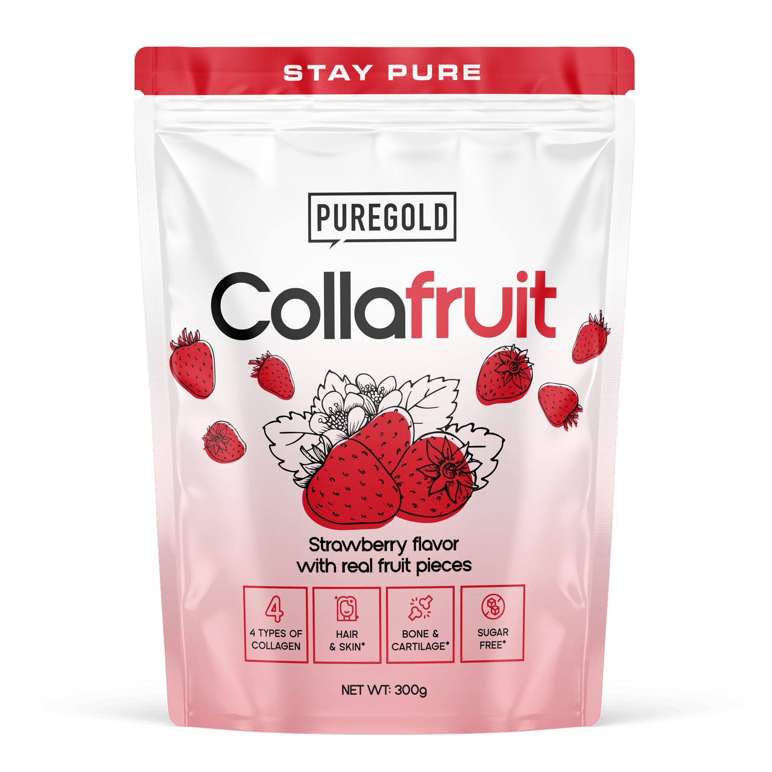 CollaFruitCollagene bovino in polvereBevanda in polvere al collagene idrolizzato di manzo Pure Gold CollaFruit con aggiunta di pezzi di fragola liofilizzati, vitamine, zinco, selenio ed edulcoranti.