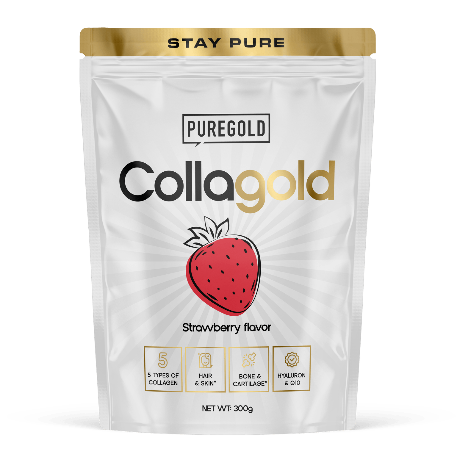 Pure Gold CollaGold è una formula complessa di collagene che contiene 5 diverse fonti di collagene. Le fonti premium di collagene sono arricchite con acido ialuronico, Q10, vitamine e minerali (vitamina C, vitamina A, zinco, selenio). Questa combinazione non solo supporta la salute di pelle, capelli e unghie, ma contribuisce anche al normale funzionamento delle articolazioni, delle cartilagini e delle ossa. Grazie al suo gusto rinfrescante si integra facilmente nella routine quotidiana.